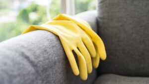 Remove pet hair from upholstery by wearing damp rubber gloves and running your hands over the fabric. The hair will stick to the gloves, making cleanup easy.